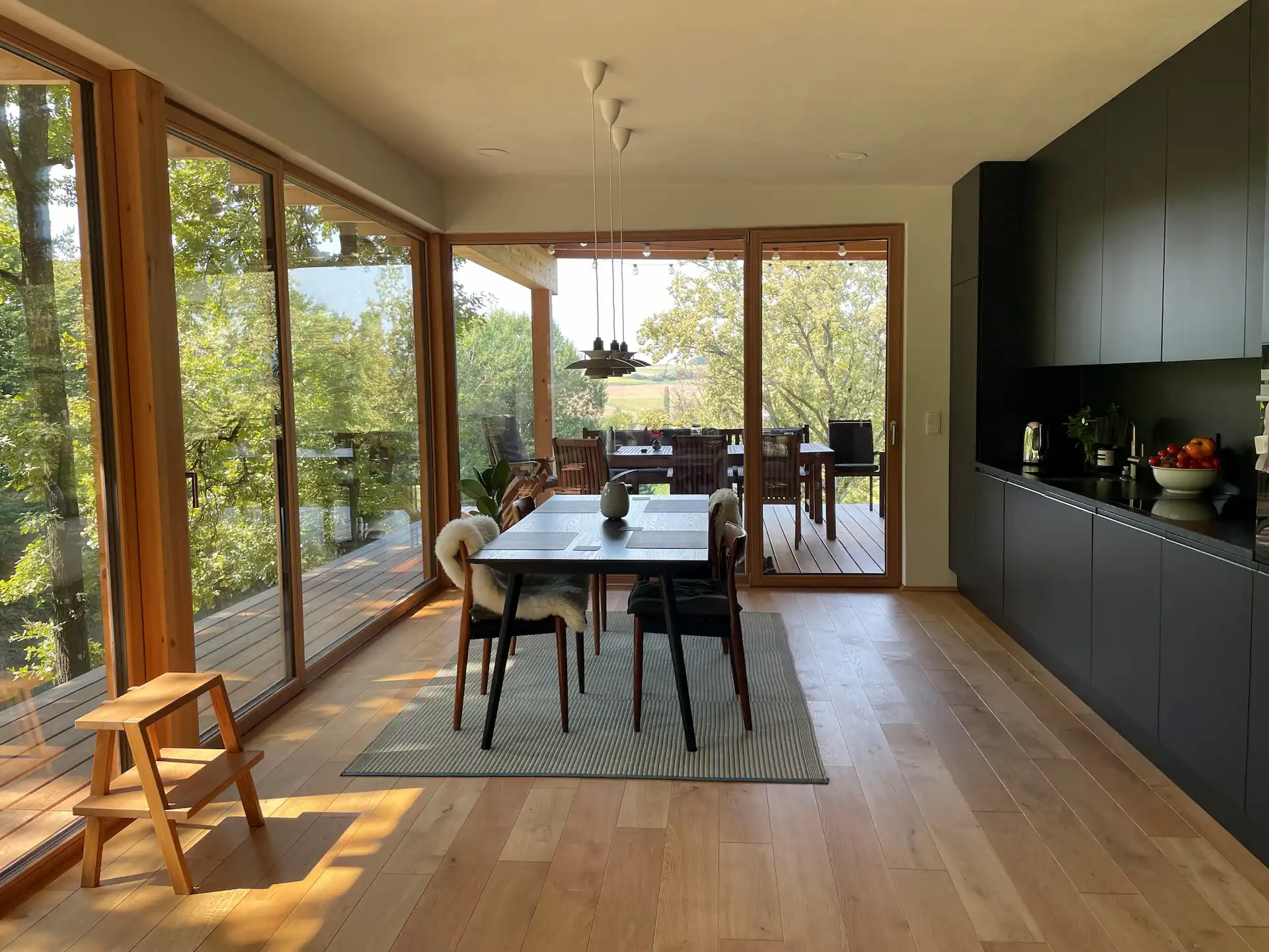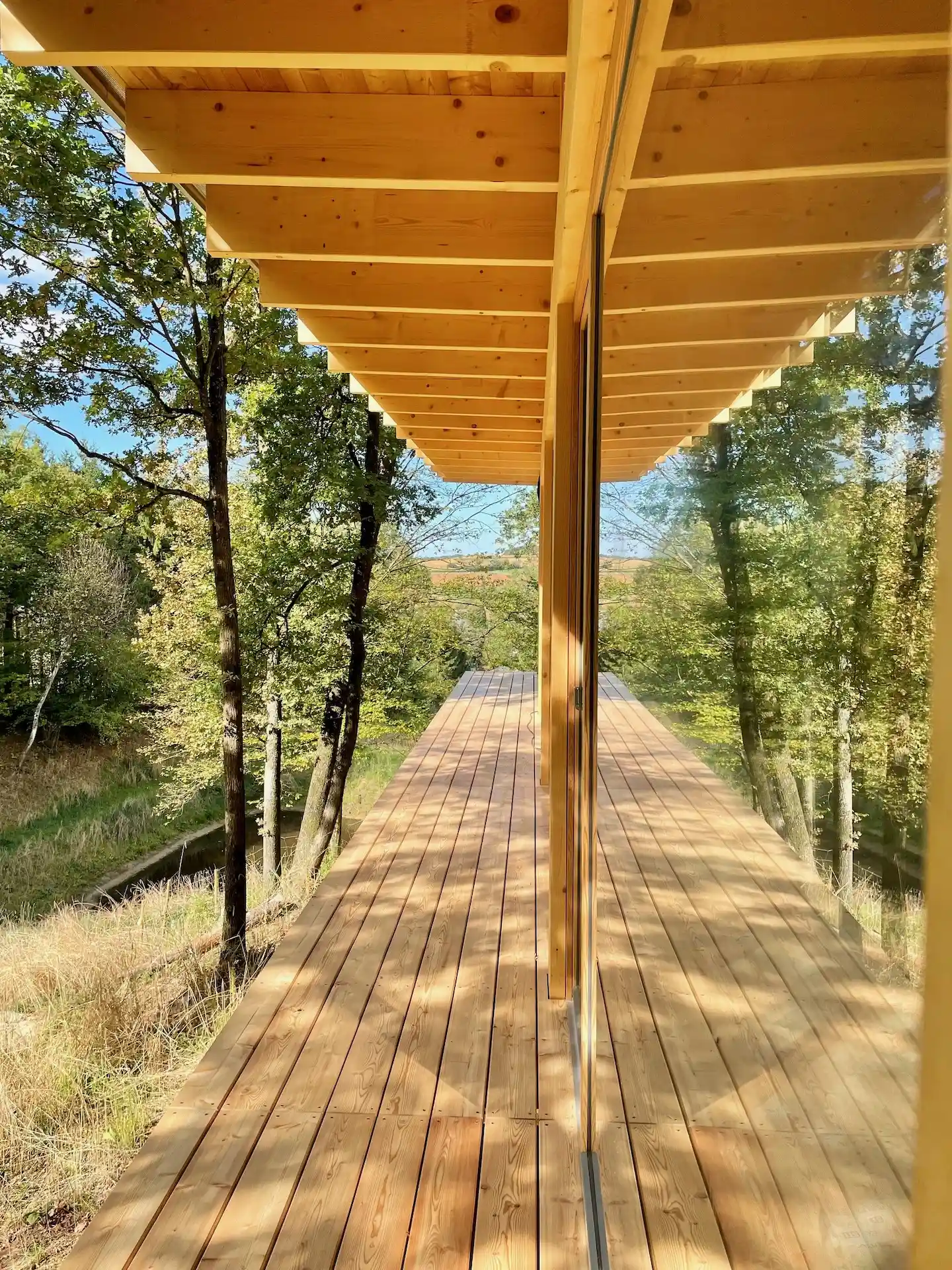Das „Haus im Wald“ liegt auf einer einzigartigen Bauparzelle in einem Waldgrundstück im südlichen Burgenland. Norah und Andreas waren auf der Suche nach einem Ort, der als Gegensatz zur Stadt Wien dient und ein Leben mit der Natur bietet – die Jahreszeiten schauen durch das Fenster herein! Die Beschattung erfolgt durch die Bäume und den großzügig gewählten Dachüberstand. Beim Nebeneingang entstand eine „mud-box“ um Gummistiefel und Arbeitsgewand zu lagern. Sepp Holzer bearbeitete und gestaltete das Grundstück mit seiner Permakultur Methode. Das Bauwerk wurde gefühlvoll in die Landschaft gesetzt und schwebt aufgeständert auf Stahlstützen zwischen den umliegenden Bäumen, ein Teich sammelt die Oberflächenwässer und dient als Treffpunkt der Waldtiere – in Zusammenarbeit mit den Bauherrn entstand ein einzigartiger Platz umgeben von Bäumen, Blättern und Landschaft.
