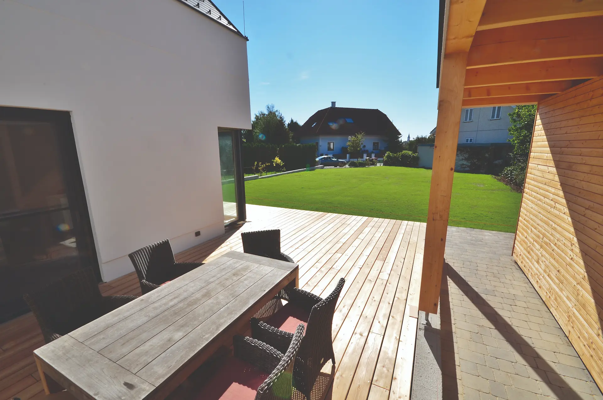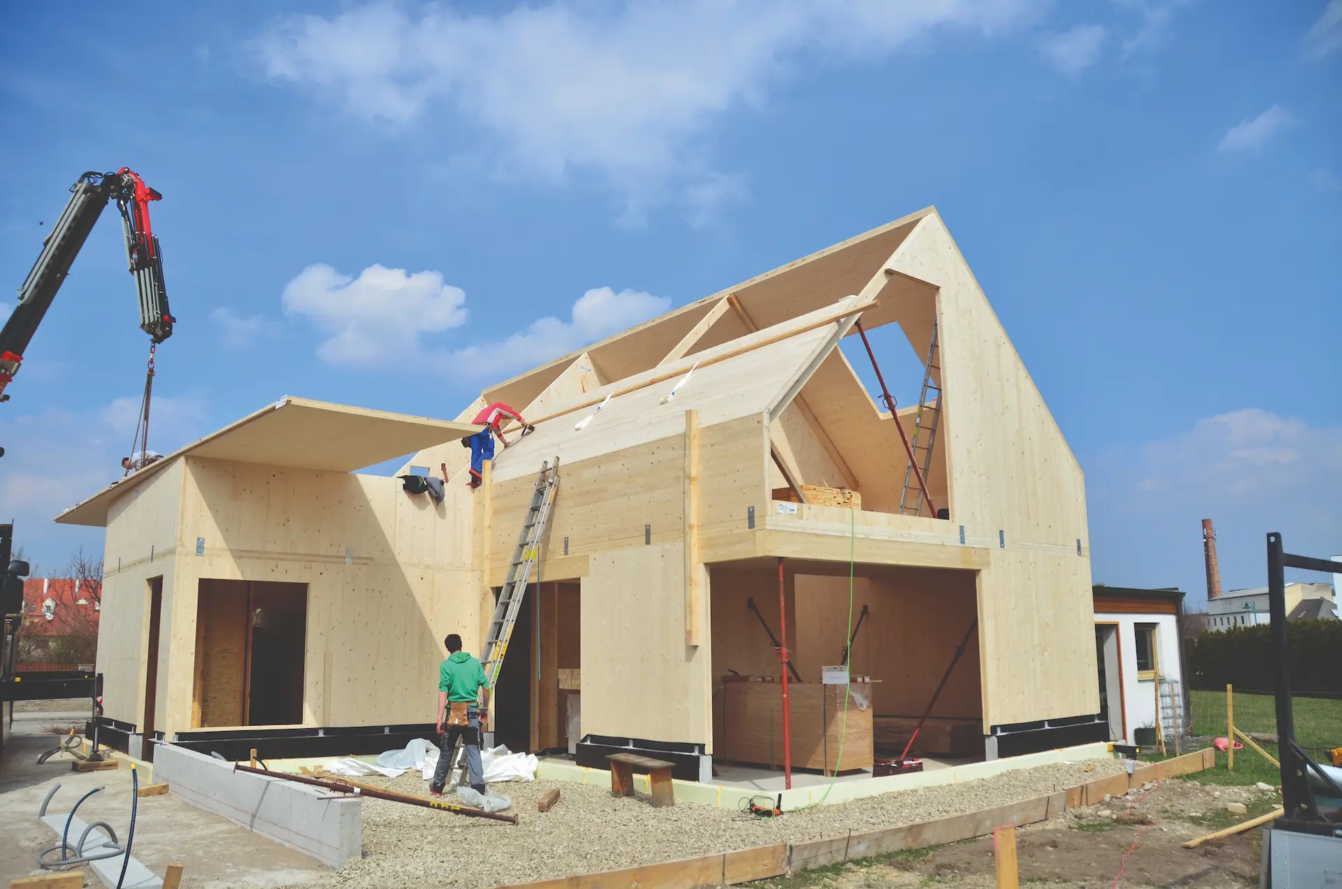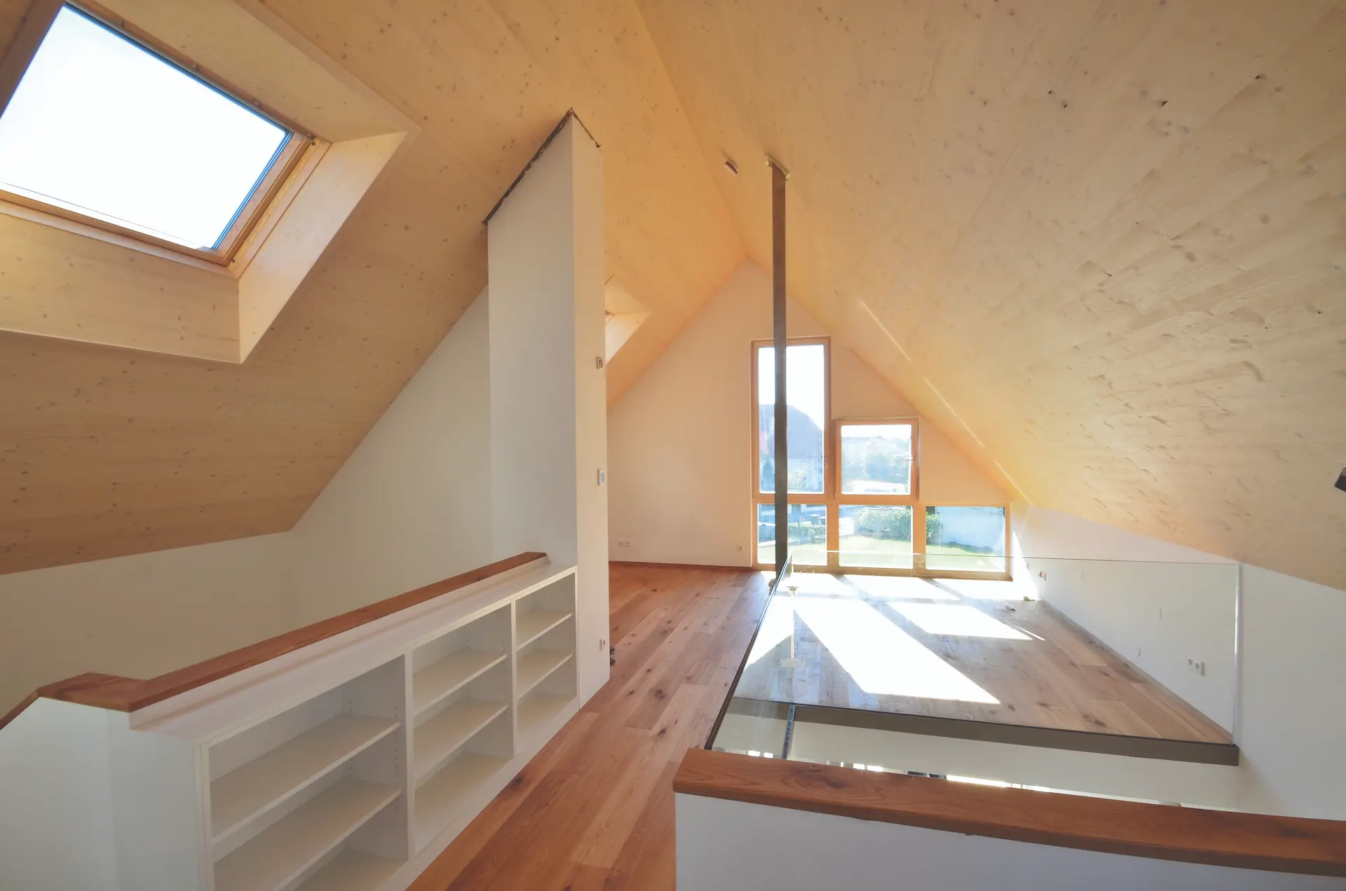 Eine Zusammenarbeit aus einem dynamischen Architektenteam (E3 ARCHITEKTEN), den Bauherren und der Firma HHH hat dieses Bauwerk entstehen lassen. Jeder hat seine Aufgabe perfekt erfüllt! Unsere Mitarbeiter auf der Baustelle haben die Massivholzplatten, welche im Innenbereich bis unter den Giebel sichtbar geblieben sind, perfekt verarbeitet. Der Massivholzrohbau wurde in zwei Tagen aufgestellt – der Bauherr hat dies in einem Video festgehalten.