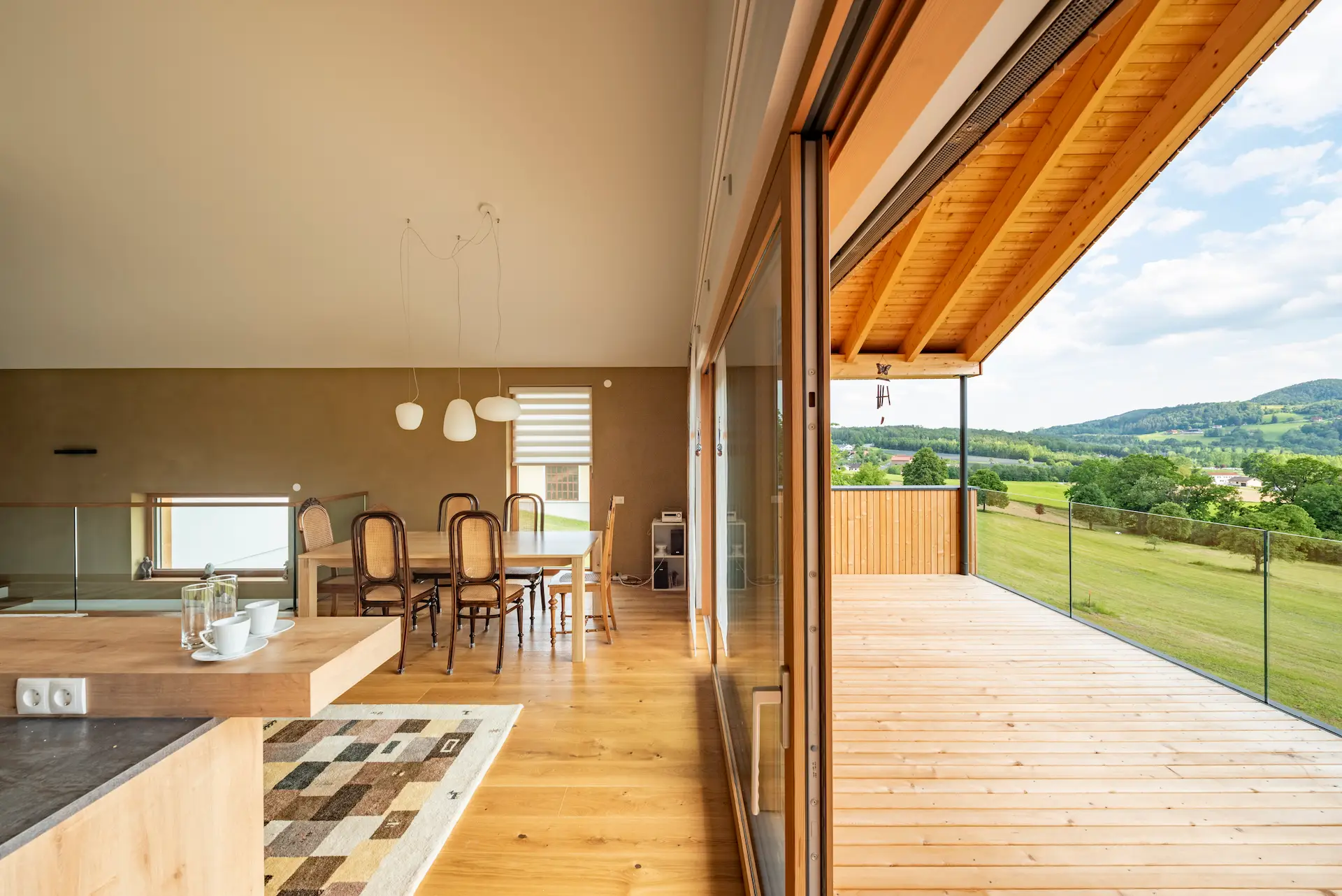 Die traditionelle Dachform, das Satteldach, bildet mit einem großzügigen Balkon in Richtung Süden eine Erweiterung des Wohnraumes.