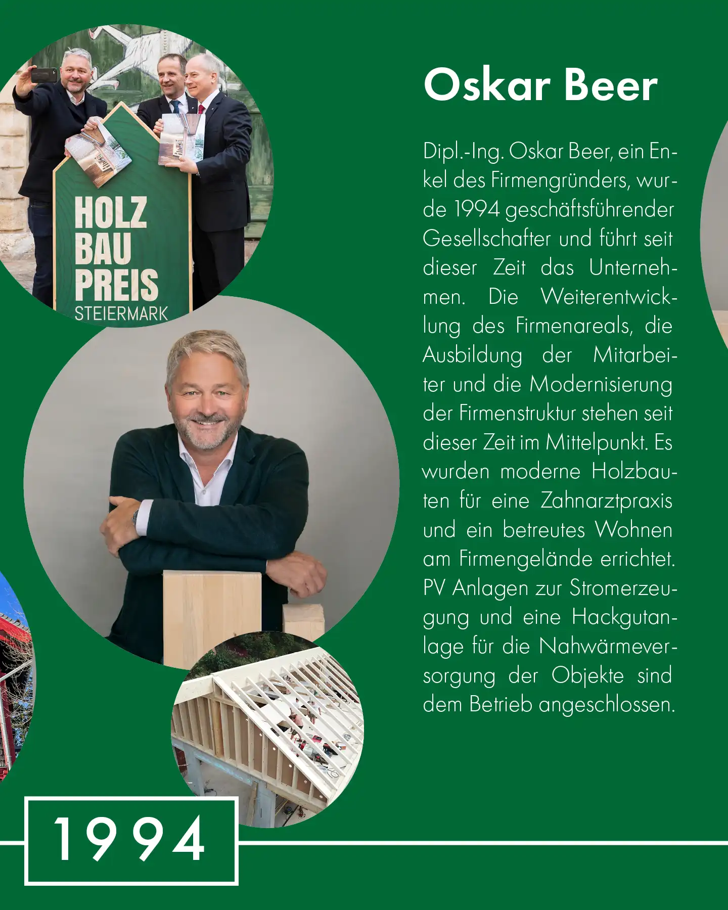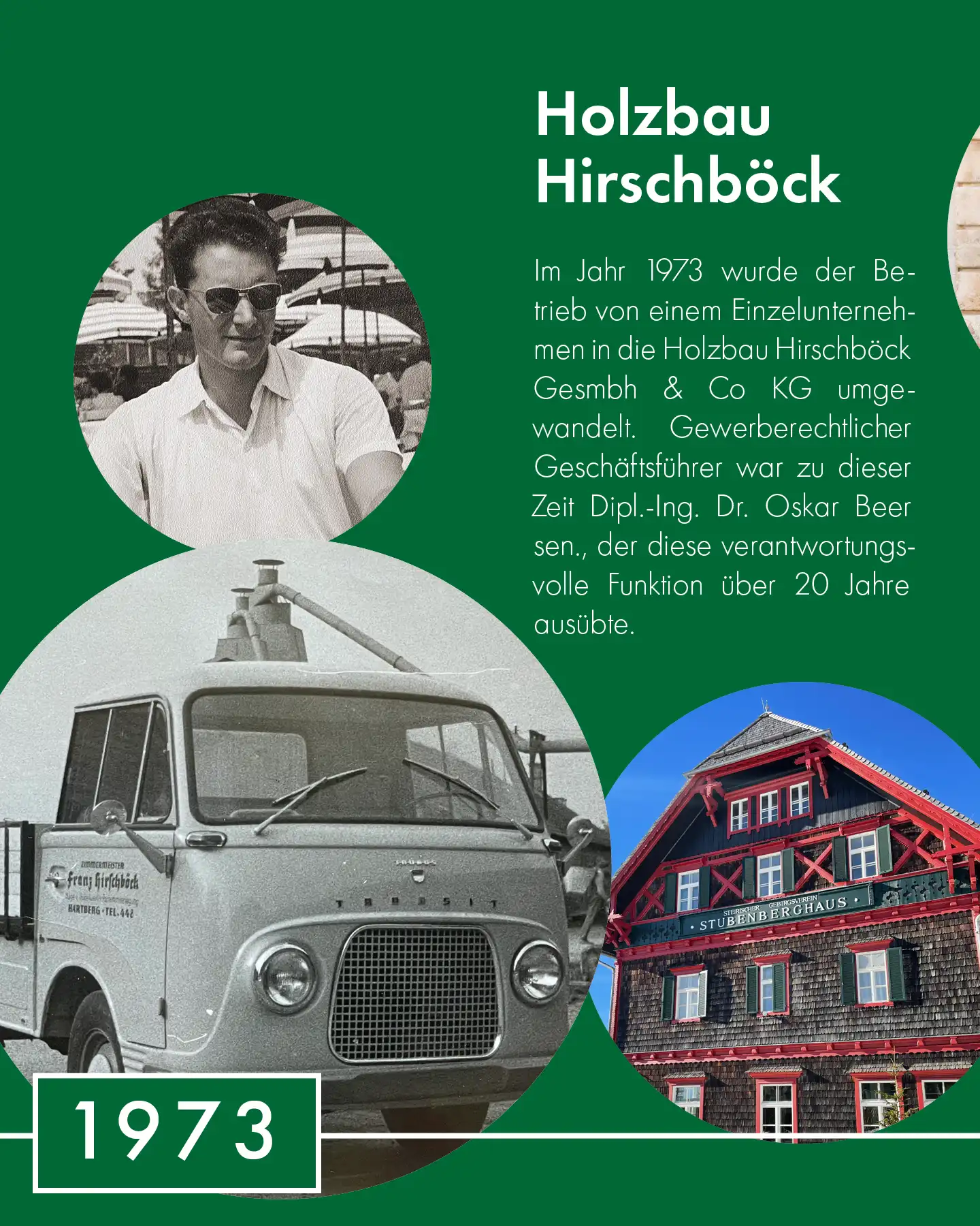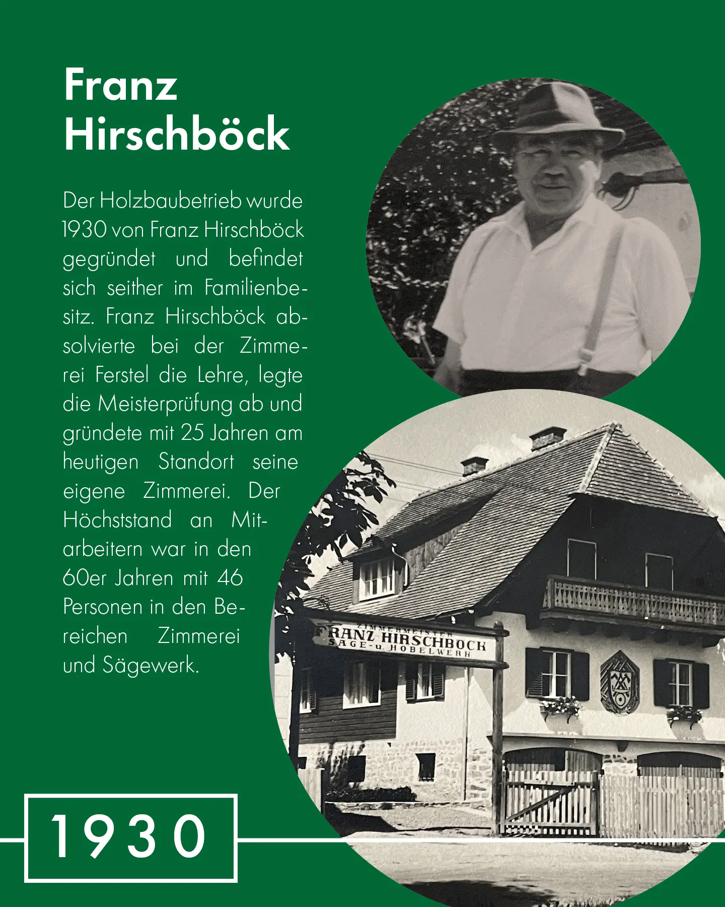 Der Holzbaubetrieb wurde 1930 von Franz Hirschböck gegründet und befindet sich seither im Familienbesitz. 1994 wurde Dipl.-Ing. Oskar Beer, ein Enkel des Firmengründers, zum geschäftsführenden Gesellschafter und 2012 Ing. Wolfgang Raser zum zweiten geschäftsführenden Gesellschafter bestellt.